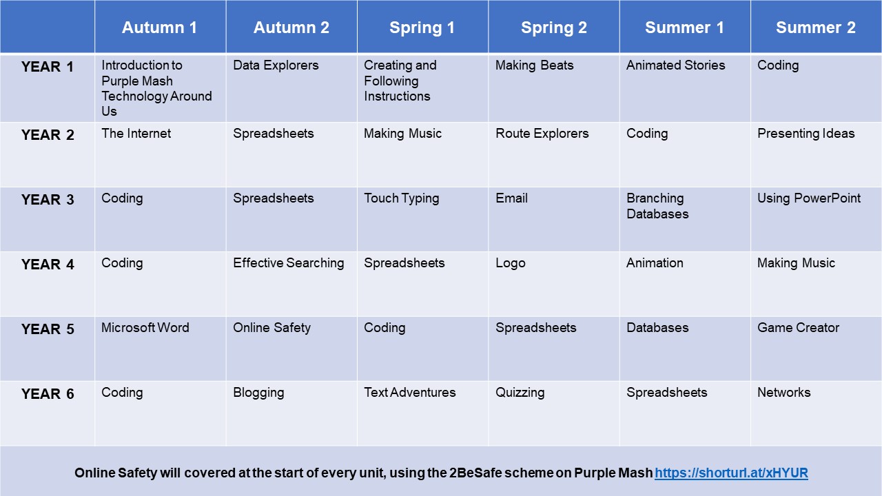 Purple Mash is a website used throughout the school to enhance learning across all subject areas.  All children have their own login and password to enable them to use the website at home.  It features a range of activities and resources designed to complement the subjects studied in school.  Children can save their work online which can then be shared in school and at home. Computing is taught using the Purple Mash scheme of work, from Year 1 - Year 6