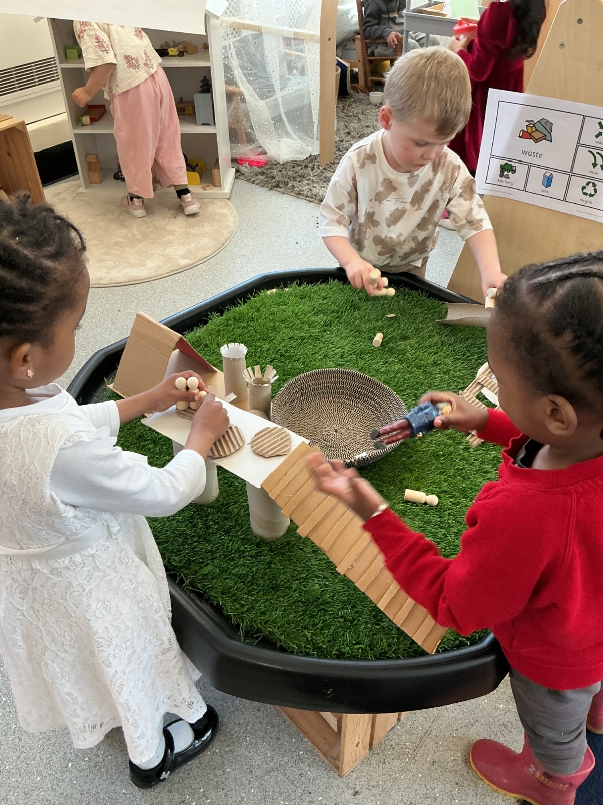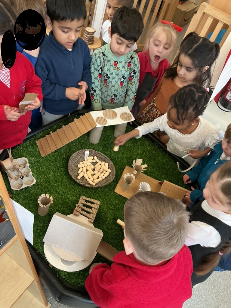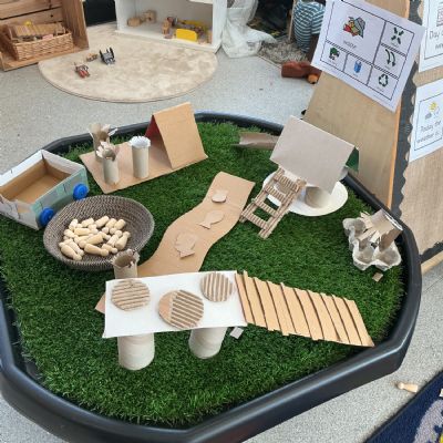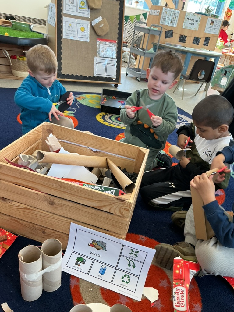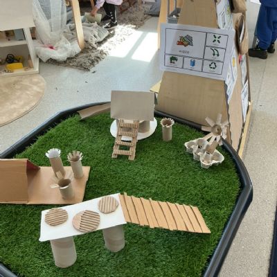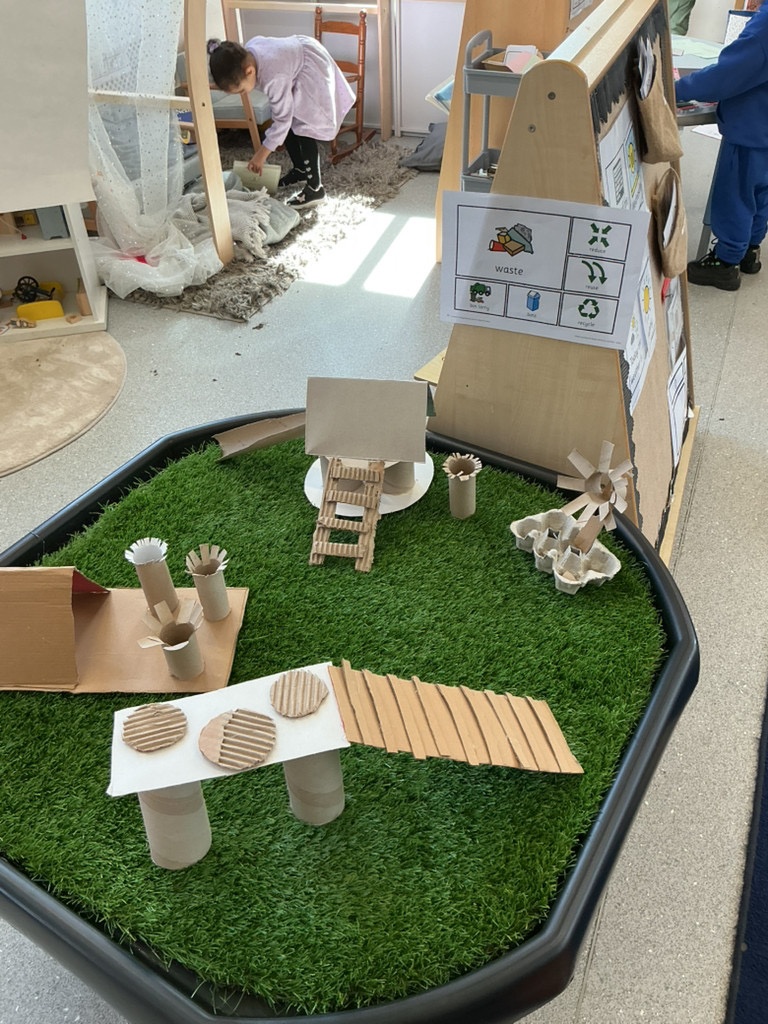We then learned and discussed the key vocabulary: reduce, reuse, recycle. Focusing on the idea of reusing, we shared ideas about how everyday waste can be given a new purpose. Inspired by this, the children decided to create their own small world using junk modelling materials.