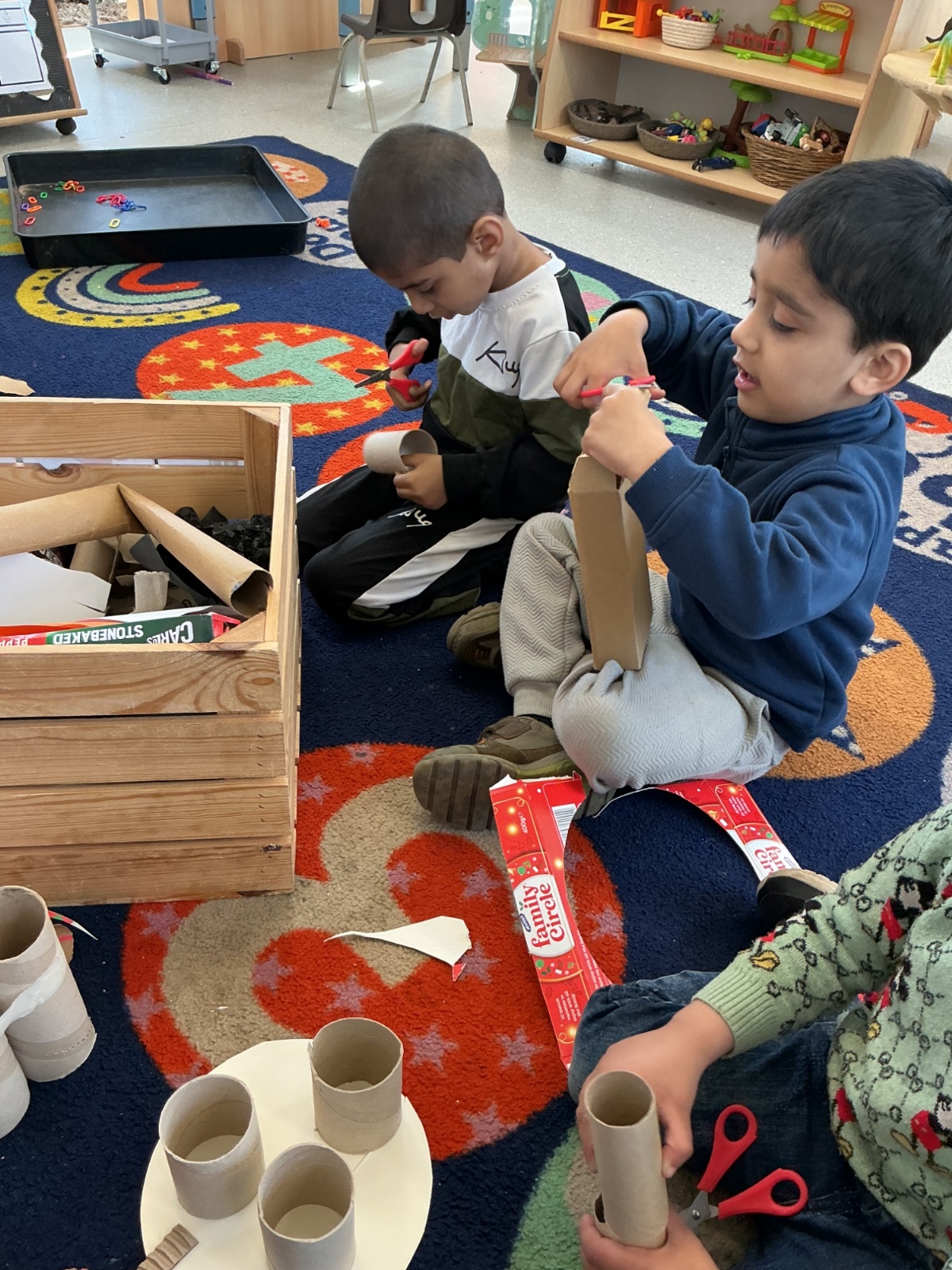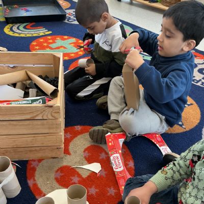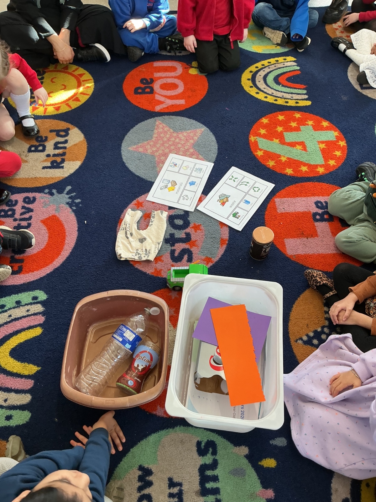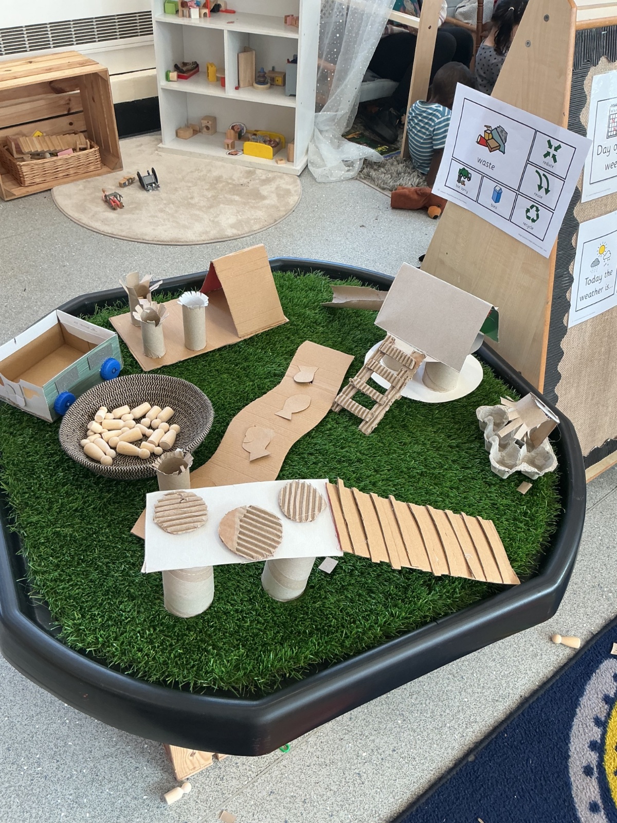 We then learned and discussed the key vocabulary: reduce, reuse, recycle. Focusing on the idea of reusing, we shared ideas about how everyday waste can be given a new purpose. Inspired by this, the children decided to create their own small world using junk modelling materials.