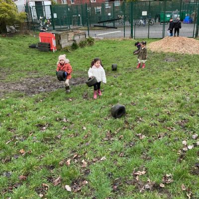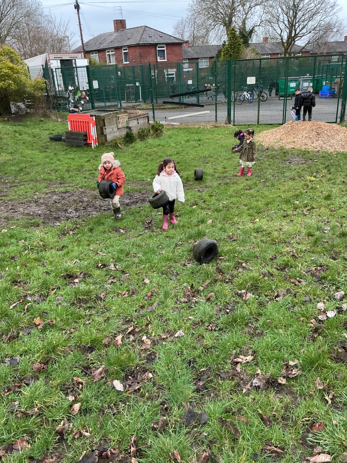 The children even invented a new game! They collected tyres and created their own race, rolling them down the hill to see who would reach the bottom first. This simple but exciting game supported their problem-solving skills, teamwork, and gross motor development—all while having lots of fun together.