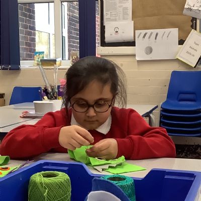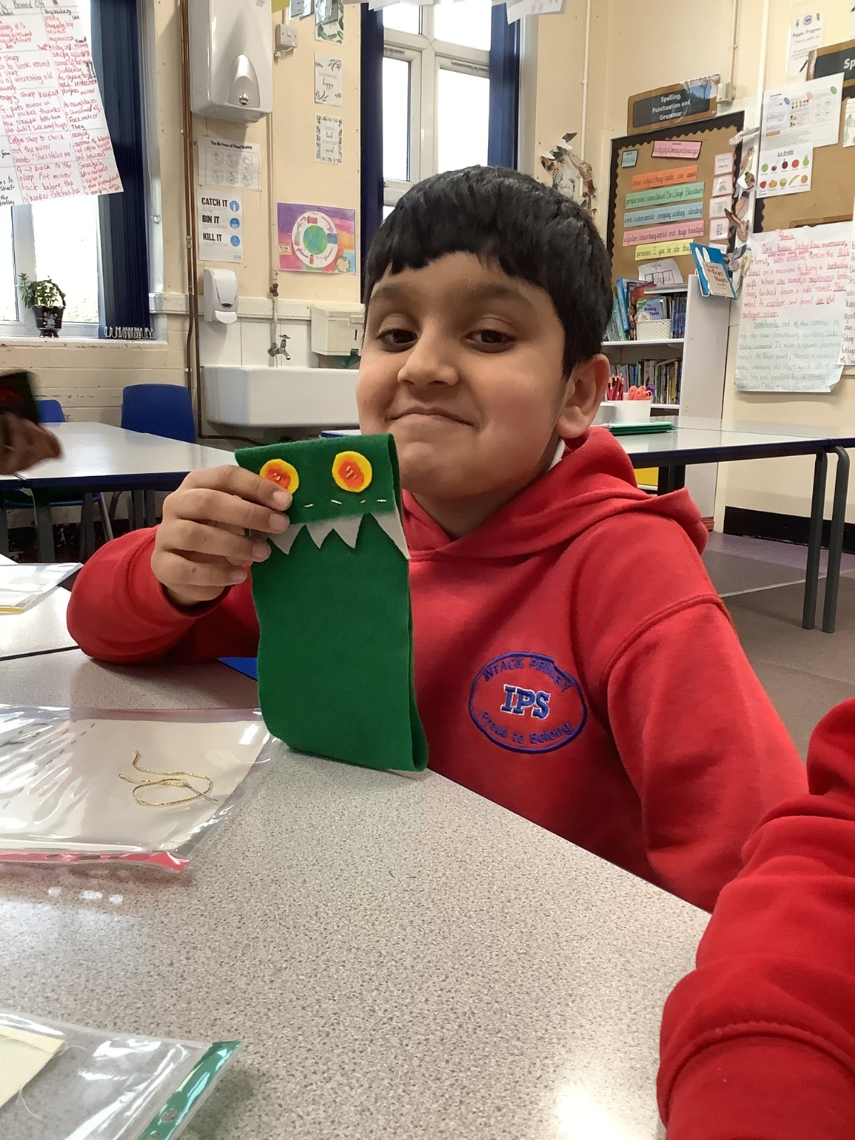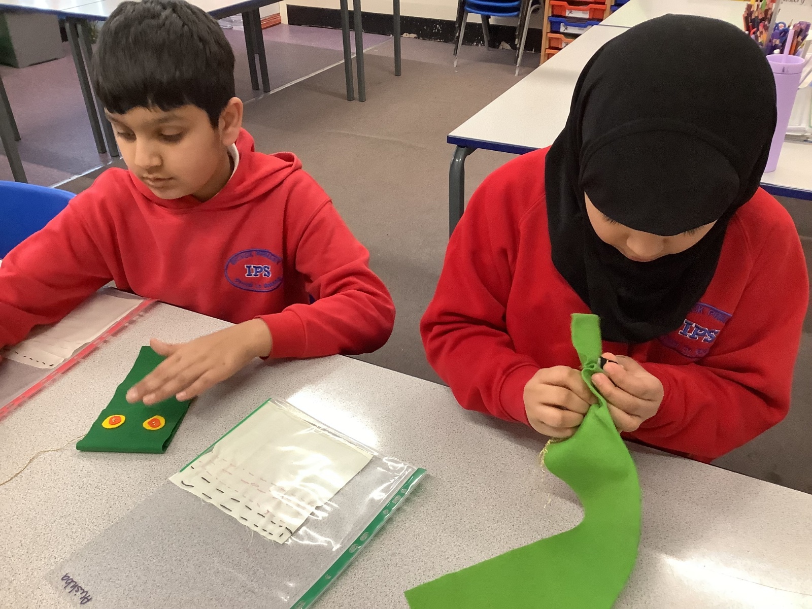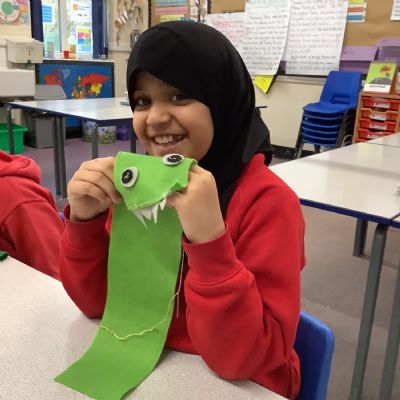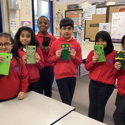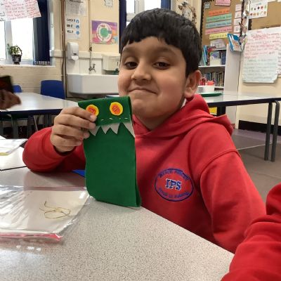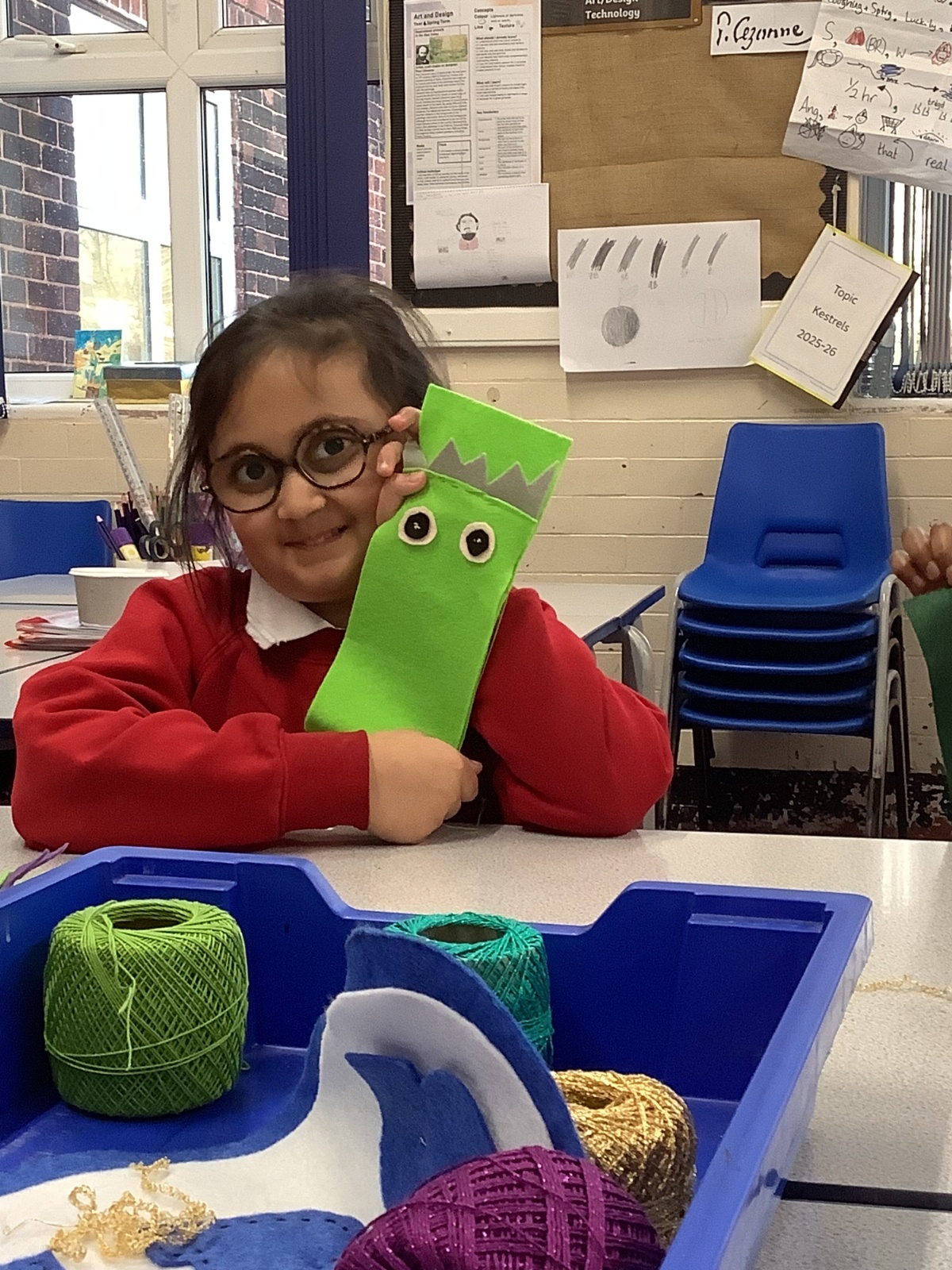 Children developed their sewing skills by learning how to thread a needle and complete a running stitch. They independently chose their own materials and colours, using their creativity to design and make a unique monster-themed pencil case!