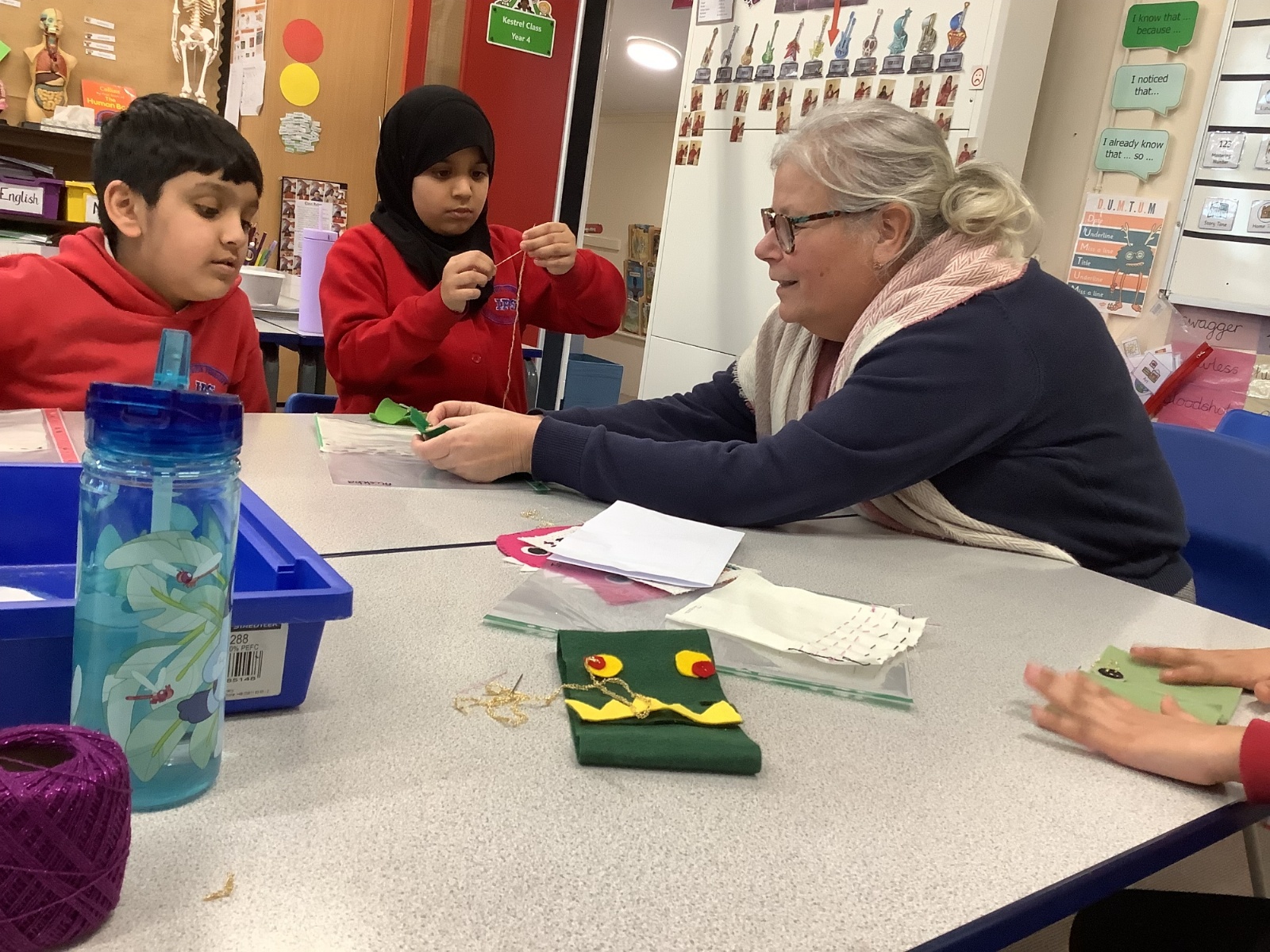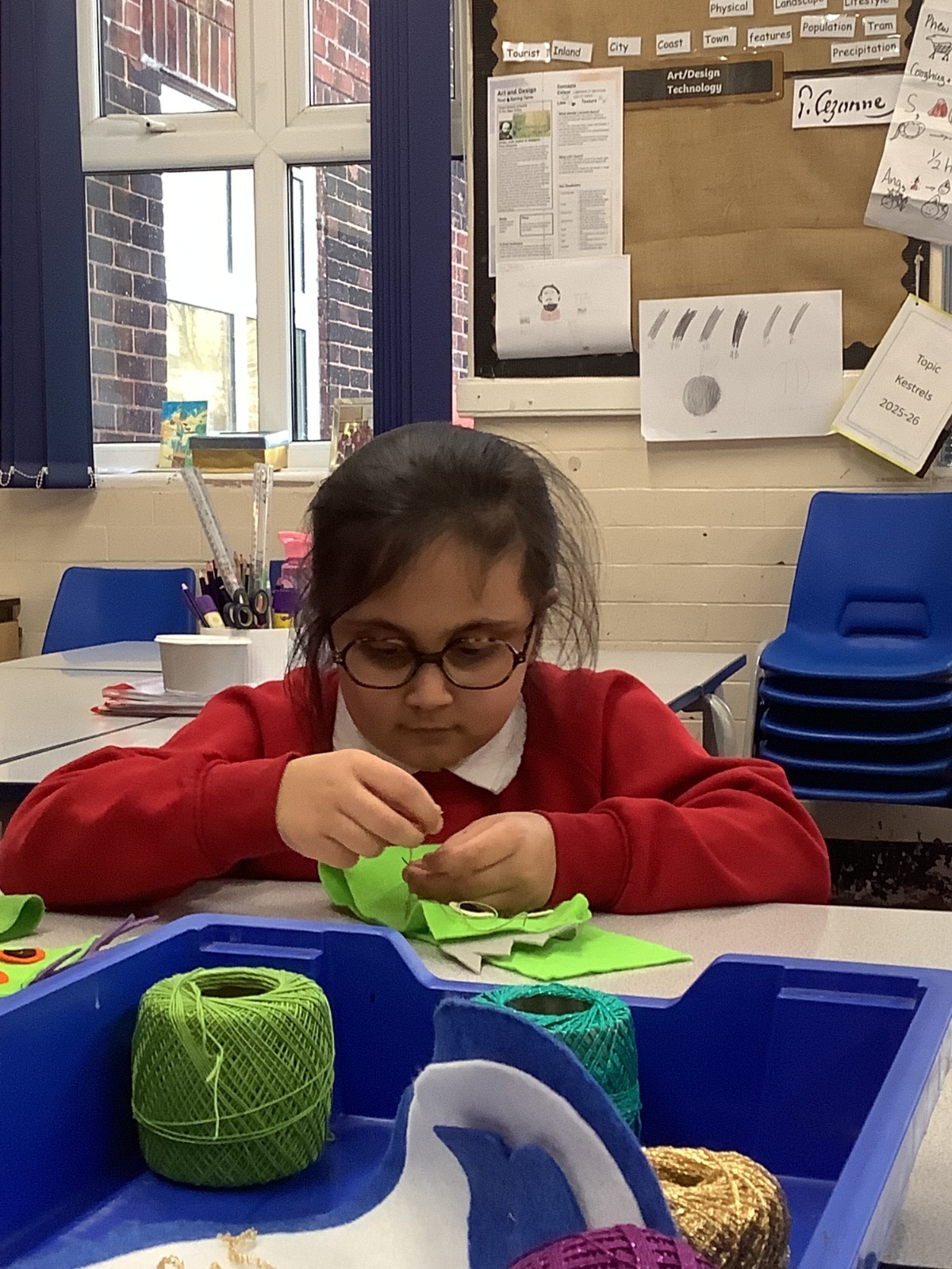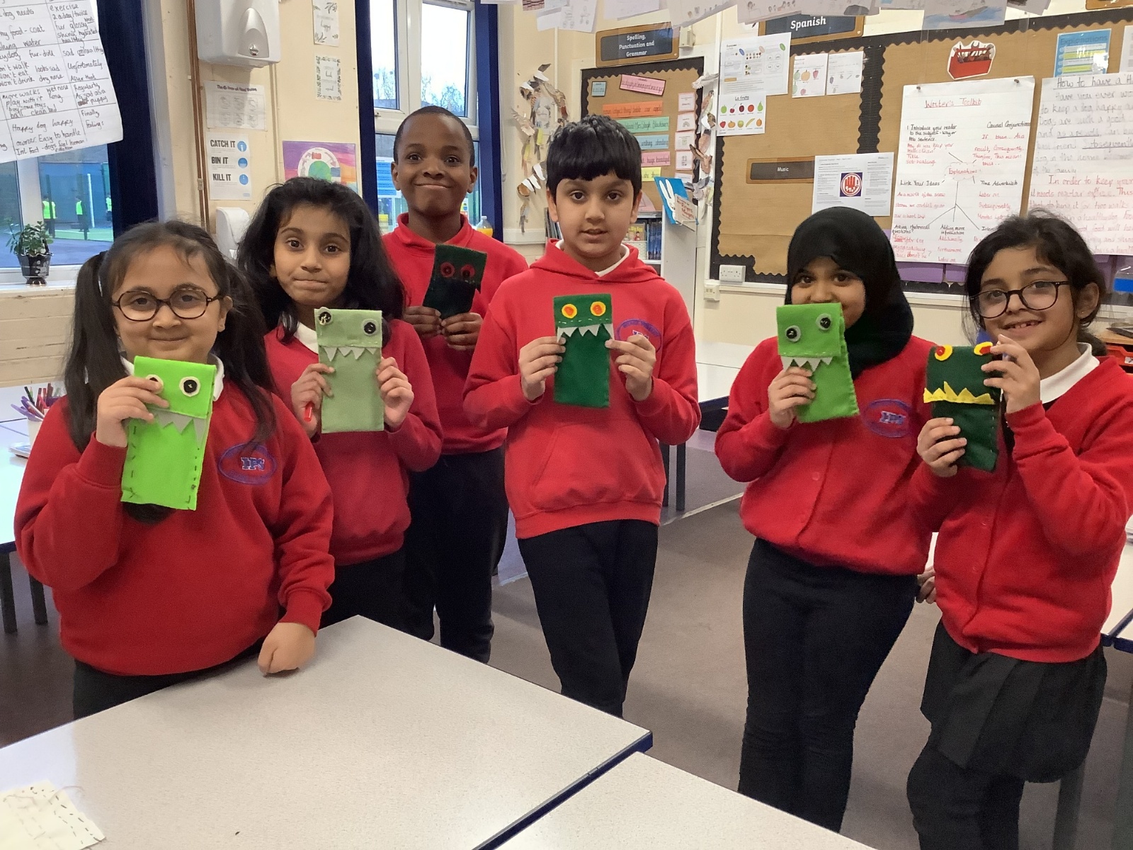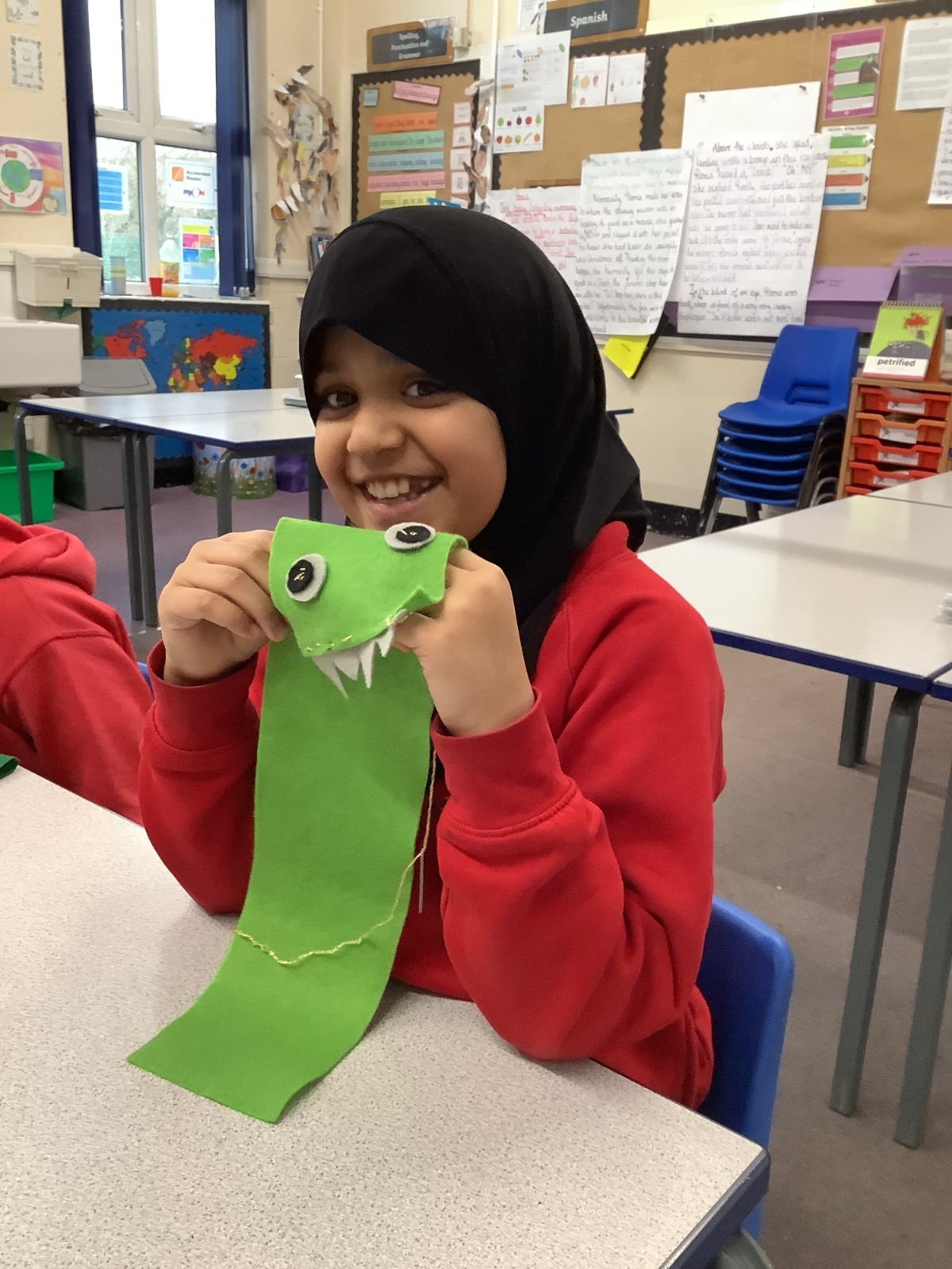 Children developed their sewing skills by learning how to thread a needle and complete a running stitch. They independently chose their own materials and colours, using their creativity to design and make a unique monster-themed pencil case!