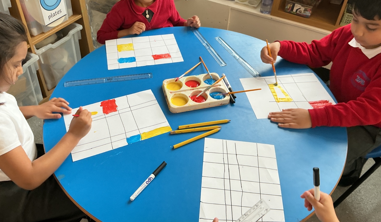 The children explored his distinctive style, noticing how he used bold black horizontal and vertical lines to create different shapes, and how he carefully chose to work with just the three primary colours: red, blue and yellow.