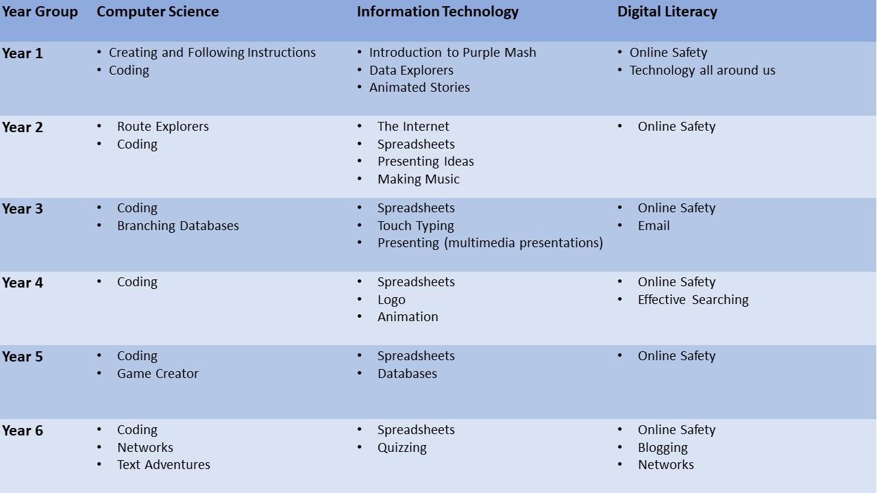 The Computing curriculum is taught using the Purple Mash Scheme of Work, which is sequenced to ensure knowledge and skills are revisited, deepened and secured over time.