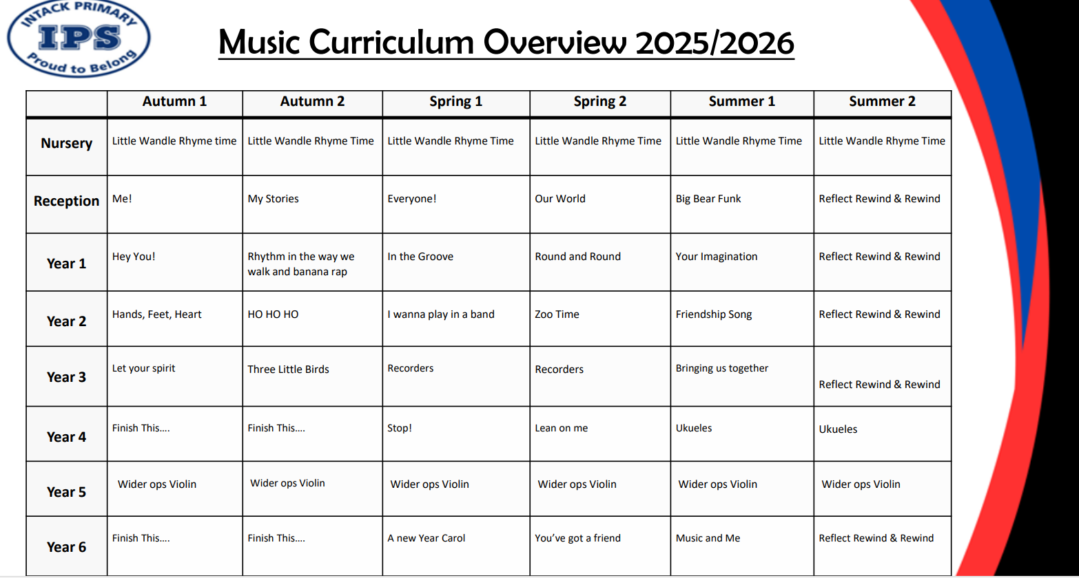 Music at Intack plays an important part in our curriculum. We believe in the significance of music in developing creativity, movement, communication and self-expression whilst also enabling children to develop memory and listening skills. Music can provide comfort and enjoyment. Additionally, it enables us to celebrate and share cultural diversities in our community and society.