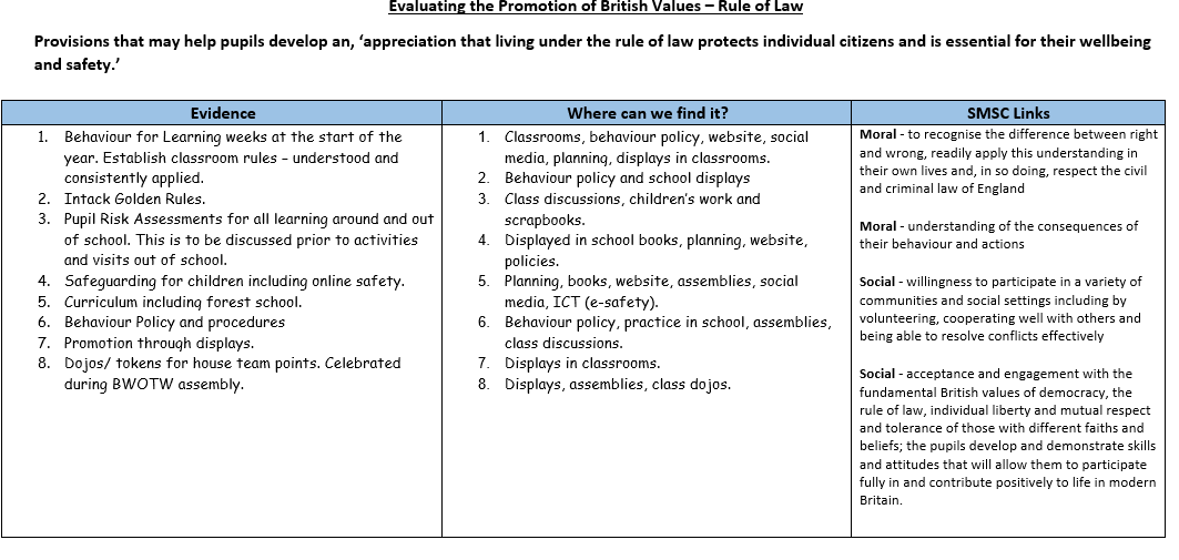 The importance of laws, whether they be those that govern the class, the school, or the country, are consistently reinforced throughout regular school days, as well as when dealing with behaviour and through school assemblies. Pupils are taught to have respect for the basis on which the law is made and how the law is applied in England. We aim to teach children the value and reasons behind laws, that they govern and protect all of us, the responsibilities that this involves and the consequences when laws are broken.