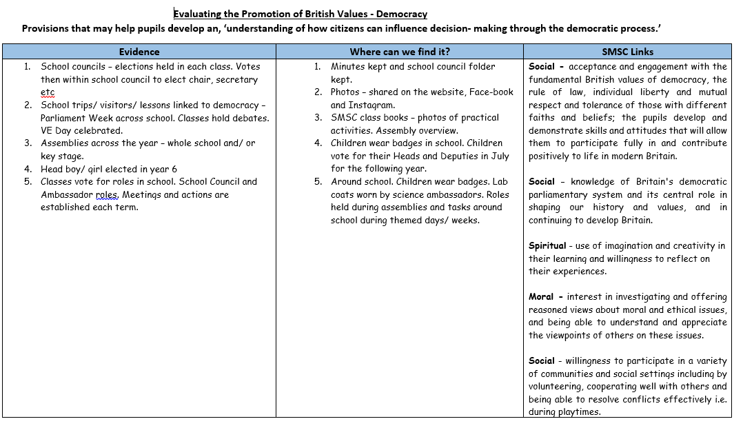 Respect for democracy, democratic participation and active involvement of all pupils is evident across the school. We aim to provide pupils with a broad general knowledge of, and promote respect for, public institutions and services. Our aim is to teach pupils how they can influence decision-making through the democratic process. For example: pupils have the opportunity to have their voices heard and are able to express their views freely through School Council. The elections of School Council representatives each year are based solely on pupil votes (which helps to highlight some of the advantages and disadvantages of democracy and how it works in Britain). This effective involvement of pupils in democratic procedures enables them to influence and make decisions on matters which affect their lives within school.